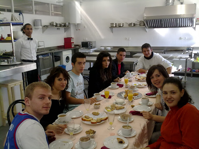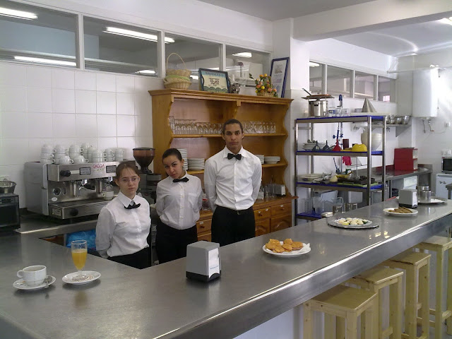 La semana pasada fueron los premios a los ganadores de los recreos deportivos y hoy han comenzado los tradicionales desayunos que ofrecen los alumnos del taller de ayudante de restaurante-bar a nuestros delegados y subdelegados para premiar su importantísima labor. Concretamente han disfrutado de unas deliciosas viandas los representantes de alumnos de los 5 primeros de bachillerato: Rafa, Andrés, Carla, Imanol, Marta, Aroa, Elisa, Verónica, José Javier y Víctor. Raniel, Diana, Lina y su profesora Zorahaida se han encargado de que no les faltara de nada. Profesionalidad y buen hacer han reinado en el taller de hostelería. Felicidades a nuestros futuros camameros y enhorabuena a los agasajados.